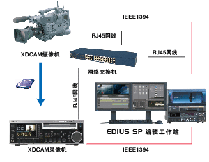安裝了EDIUS Broadcast選件的EDIUS SP(帶HD擴展件)編輯工作站可通過IEEE1394或RJ45網絡接口快速導入/導出XDCAM素材,使用代理碼流(Proxy)編輯和MXF文件的后臺導入功能,可大大提高XDCAM素材的編輯效率。通過對XDACM SAM(簡單訪問模式)的支持,可更好的保證代理碼流(Proxy)的編輯效果。