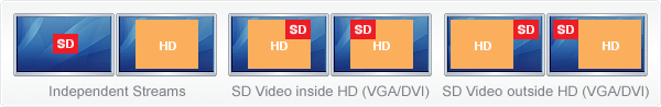 流VGADVI Broadcaster可以輸出單個流或兩個獨立流(最高能達到30FPS)。通過HTTP,RTP,UDP等方式,使用標準的瀏覽器和播放器就可以觀看 管理員可以在輸出的流上自定義布局:如圖片,時間,版權標志和臺標等等 |