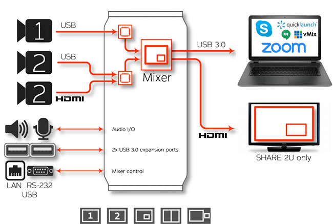 該設備可以由主機端的應用程序使用我們的USB HID, RS-232 或 LAN 進行控制. 您還可以使用設備頂部的鍵盤來手動控制。您可以使用 SHARE 2U 的Mixer 功能將兩個視頻源嵌入到一個流中。如果您的應用程序僅支持一個視頻接口,例如Skype?, Zoom?, Webex?, GoToMeeting? 和所有視頻會議應用程序,則此功能可以為您提供重要技術保障。