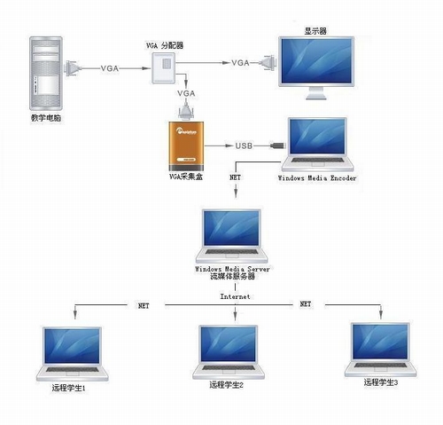 同步教學也就是實時教學,其實現過程如下:實時教學時,先把教師機(教師機需裝有麥克用來錄老師的聲音)的顯卡輸出給VGA分配器,再由VGA分配器分別輸出給顯示器和VGA采集盒(建議使用Epiphan的,本人使用過效果不錯),采集盒需通過USB接到已安裝Windows