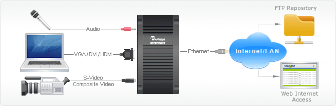 錄制設備或系統接收顯示源后編碼,并用不同的比特率和編碼選項記錄在本地存儲為AVI或MOV文件。這些記錄可以從內置WEB服務器中被找到或自動推到網絡存儲位置。