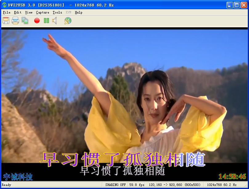 6. 現在就是設置完成后的實時預覽效果,如下圖所示,幀速率達到了59.8fps,采集大小由1024x768剪切為800x500,并在視頻的左下角顯示了自己的文字和右下角顯示了當前的時間。