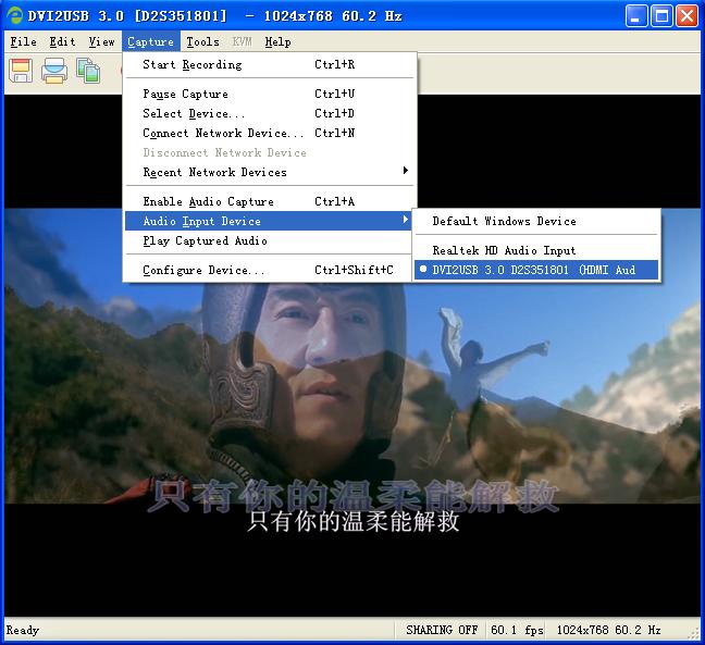 3. 單擊“Capture”菜單下“Audio Input Device”選項,選擇音頻輸入設備為“DVI2USB 3.0……”。