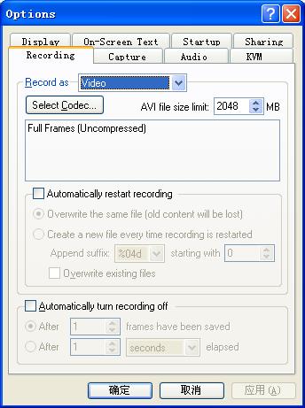 2. 默認打開“Recording”選項設置窗口,在“Record as”項后的下拉菜單中選擇要采集成Video視頻還是Image圖片序列,點擊“Select Codec…”選擇編碼器(若系統中裝有其它編碼插件,則可在此項中選擇應用,默認無壓縮文件會特別大)。