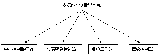 該系統(tǒng)主要有四個(gè)子系統(tǒng)組成分別是:中心控制服務(wù)器、前端應(yīng)急控制器、編單工作站、播放控制器。結(jié)構(gòu)圖如下:
