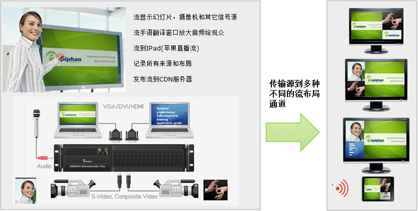 Epiphan的VGADVI Broadcaster Pro?可以從多個視頻源輸入并輸出多個視頻流。例如,從主持人鏡頭的視音頻內容,主持人的筆記本電腦演示,手語翻譯的實時觀看,封閉字幕的實時顯示以及會議的音頻內容。在一個活動中可以使用VGADVI Broadcaster Pro創建各種實時視頻的輸出通道與各種內容源的布局。