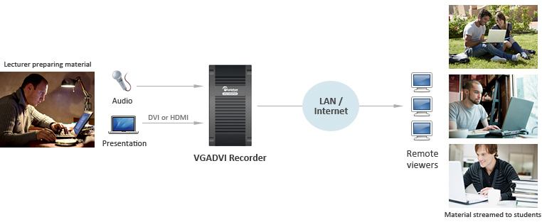 伴隨著教學設計的科技進步,對任何遠程教育課程來說,都是極為重要的。在今天先進技術和產品的整合,打造了高效的遠程學習。 VGADVI Recorder是一個可靠和具有成本效益的錄像設備,它為遠程學習者提供的教育內容準備了獨特機遇。能同時從HD和SD信號源捕捉視頻及音頻的能力,這些顯著優勢也為教育內容的開發提供了廣泛的可能性。您可以出于教育目的,選擇將數據記錄為一個視頻流或兩個同步流。所記錄的數據可以通過實況流或事后從服務器中查看。