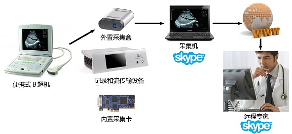便攜式B超機是遠程戶外救援隊的一個非常關鍵的工具,如果是專家親臨現場,可以極為方便的查看病情,但有些專家并非有時間能親臨救護現場,于是當現場的救護人員請求在醫院或是其它地方專家指導操作時,能看到現場病人的實際情況就成了非常重要的關鍵。現場救護人員可以攜帶著便攜式的艾普飛產品,然后將B超機的圖像輸出到艾普飛設備,后再將其連接到可以上網的筆記本電腦,即可通過skype或QQ等網絡聊天工具調用,這樣遠程的專家就會像身臨其境般的看到病人的病情并加以指導。